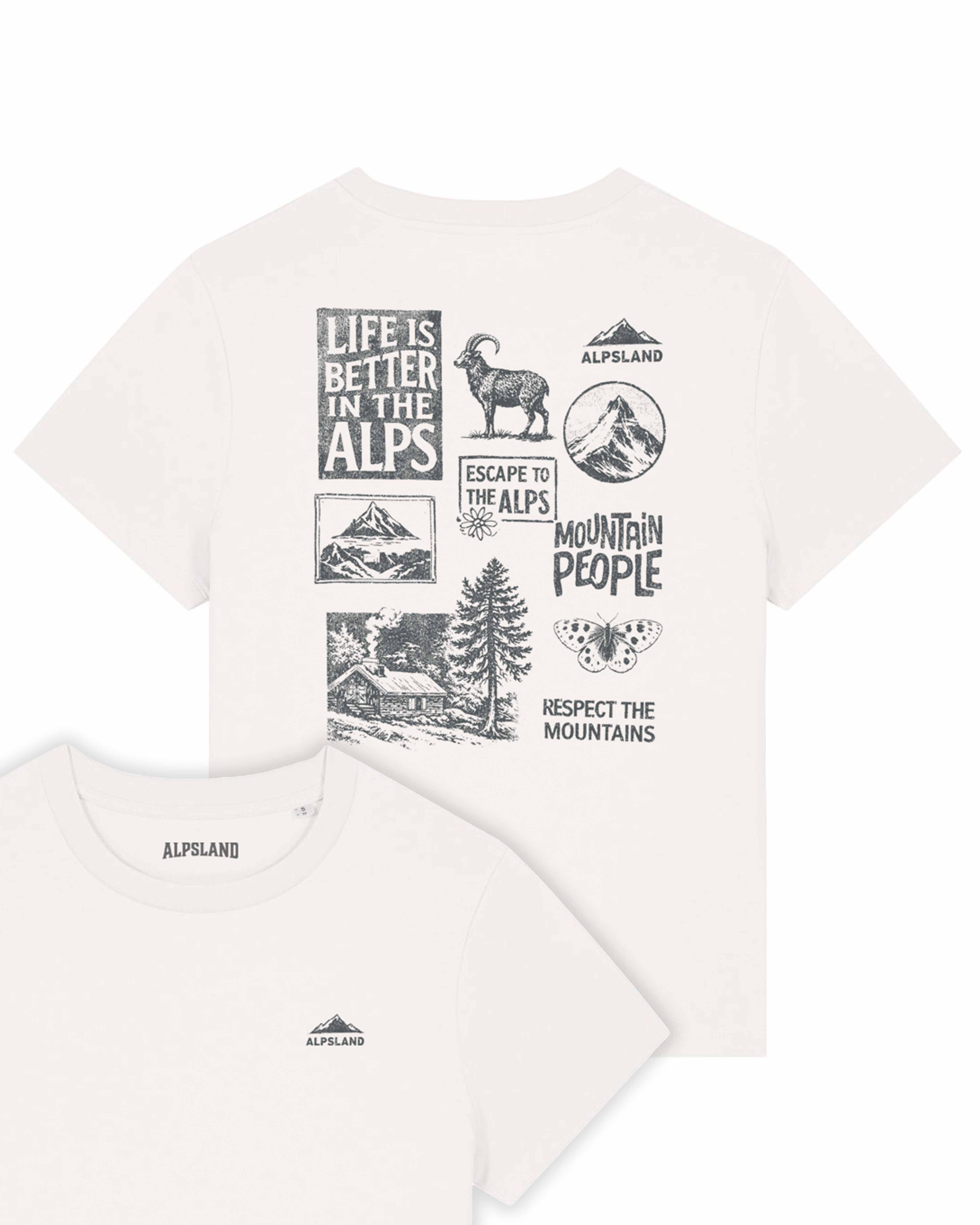 Steinbock, Berghütte, Gipfelkreuz – das Mountain People Shirt ist wie ein Reisetagebuch auf dem Rücken. Für alle, die sich in den Bergen zuhause fühlen und das auch zeigen wollen. Sticker-Collage-Stil, handgedruckt, ein Stück Alpenleben zum Anziehen.